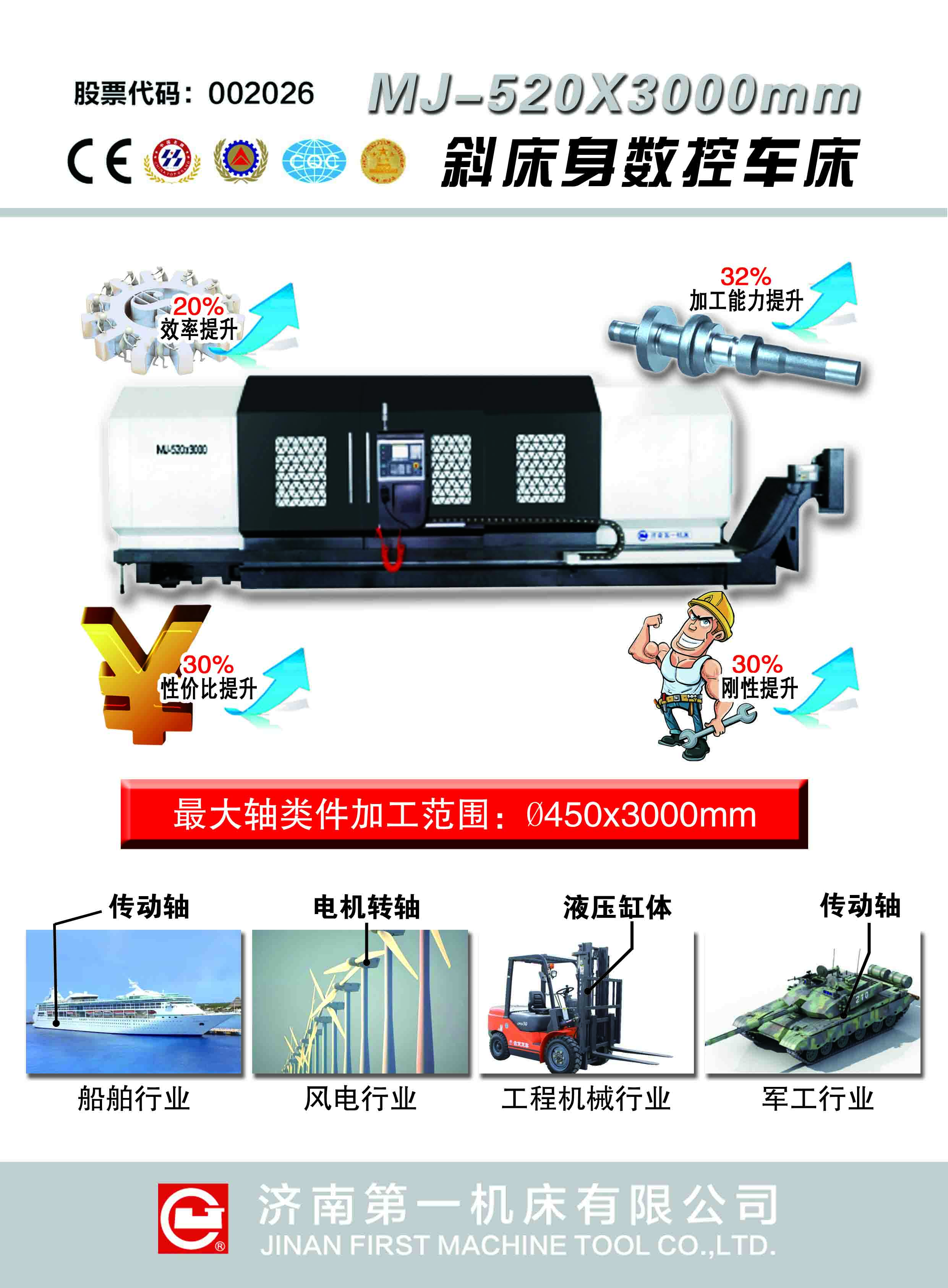 MJ-520系列精密數控車床是濟南一機床與美國M.M.T公司,以國際同類產品的先進水平為目標聯合開發設計的斜床身精密數控車床。本產品采用筒式筋板+密金格整體45°斜床身結構;剛性比上代提高30%以上;淬硬導軌,特別適合強力加工,且具有良好的精度保持性、穩定性;全面的防護,主導軌和尾座導軌均帶有伸縮防護,配套噴淋系統可有效的解決積屑問題;時尚的全封閉防護,造型現代、美觀;新的防護結構,更能良好的防水、防屑;本機床還可選配不同的配置,特別是可選擇具有伺服進給的中心架或者帶有伺服進給、套筒伸縮功能的副主軸配置;副主軸可安裝卡盤或者頂尖,通過與主軸配合實現長軸工件的兩端同時夾持(漲緊),提高工件的剛性,減少撓度,提高工件的加工質量和尺寸精度,有效解決長軸零件加工甩動慣性大、加工精度差的問題;特別適合長軸類的加工。本機床輔助功能強大,可參與自動化,進行流水線作業。
